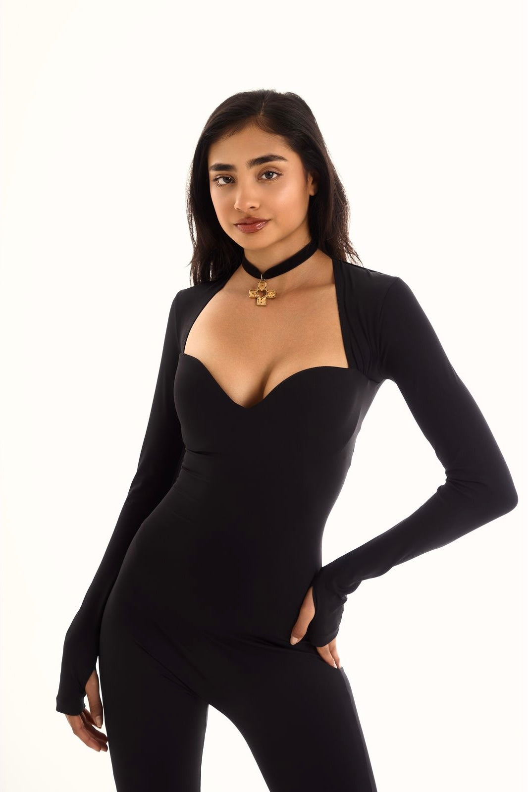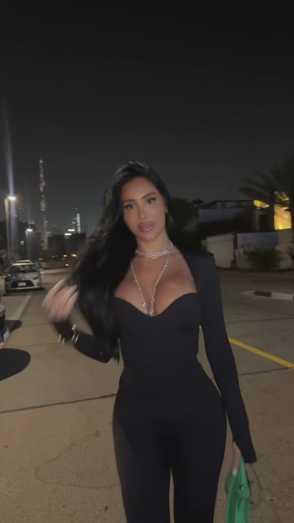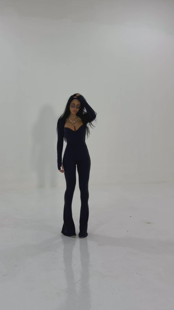 Combinaison longue évasée au design sculptant, pensée pour sublimer la silhouette avec une allure vintage couture. Haut gainant effet push-up naturel, taille galbée et manches longues avec passage pouce pour une touche mode affirmée. Sa coupe fluide et évasée allonge la ligne et se porte aussi bien en journée qu’en soirée.